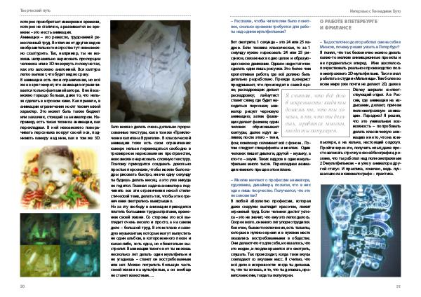 – Многие мечтают о профессии аниматора, художника, дизайнера, полагая, что в них одно лишь творчество. Получается, что это не совсем так? В любой абсолютно профессии, которая даже снаружи выглядит красочно, лежит огромный труд. Если человек достиг успеха – это не значит, что ему это легко далось. Скорее всего, он много лет упорно трудился. Конечно, бывают исключения, есть таланты, которые в нужное время и в нужном месте оказались востребованными в обществе. Они делают что-то для себя, и оказалось, что это модно, и людям нравится это смотреть, слушать. Так происходит, когда твои вкусы совпадают со вкусами масс. Я считаю, что всё дело в искренности: когда ты делаешь то, что ты хочешь, и то, что ты делаешь, нравится многим, тогда ты популярен.
