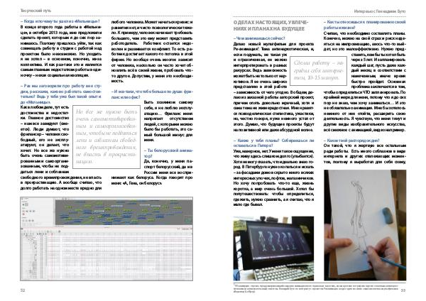 – Какие у тебя планы? Собираешься ли оставаться в Питере? Уже, наверное, нет. У меня такое ощущение, что живу здесь слишком долго( улыбается). Хотя не могу сказать, что идеально знаю город. В Петербурге нужно копаться и искать – за фасадами домов скрыто много всяких интересных улочек, лофтов, магазинчиков. Но хочу попробовать что-то еще, жизнь коротка, а мир очень большой. Хотел бы попутешествовать: чтобы определиться, где жить, нужно сравнить, а я считаю, что я мало где бывал.
