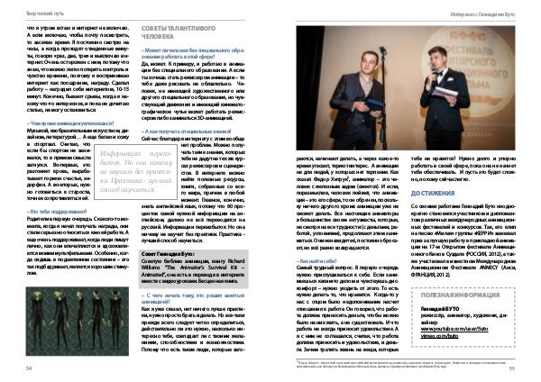 Интервью с Геннадием Буто раются, начинают делать, а через какое-то время угасают, теряют интерес. А анимация не для людей, у которых нет терпения. Как сказал Федор Хитрук 2, аниматор – это человек с железным задом( смеется). И если, поразмыслив, человек поймет, что анимация – это его сфера, то он обречен, поскольку ничего другого кроме анимации уже не сможет делать. Все настоящие аниматоры в большинстве своем энтузиасты, которые, не смотря на все трудности( с деньгами, работой, условиями), продолжают этим заниматься. Они ненавидят её, постоянно бросают, но всё равно возвращаются.