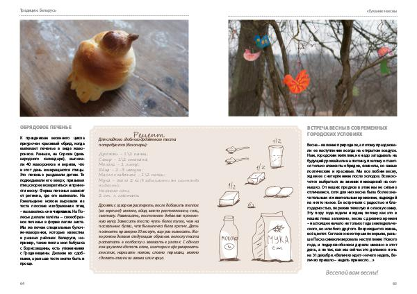 К праздникам весеннего цикла приурочен красивый обряд, когда выпекают печенье в виде жаворонков. Раньше, на Сороки( день народного календаря), выпекали 40 жаворонков и верили, что в этот день возвращаются птицы. Это печенье раздавали детям. Те подкидывали его вверх, призывая птиц скорее возвратиться и принести весну. Форма печенья зависит от региона, где его выпекали. На Гомельщине ножом вырезали из теста плоские изображения птиц – назывались они чирками. На Полесье делали галёпы – своеобразное печенье в форме лапки аиста. Мы же печем специальные булочки-жаворонки, которые известны в разных районах Беларуси, например, такие пекла моя бабушка с Борисовщины, есть упоминания с Гродненщины. Делаем их сдобными, а раньше тесто могло быть и проще.