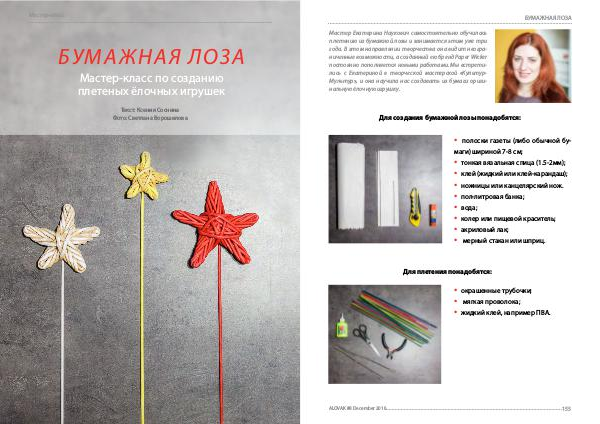 Мастер Екатерина Наукович самостоятельно обучилась плетению из бумажной лозы и занимается этим уже три года. В этом направлении творчества она видит неограниченные возможности, а созданный ею бренд Paper Wicker постоянно пополняется новыми работами. Мы встретились с Екатериной в творческой мастерской « Культур- Мультур », и она научила нас создавать из бумаги оригинальную ёлочную игрушку.
