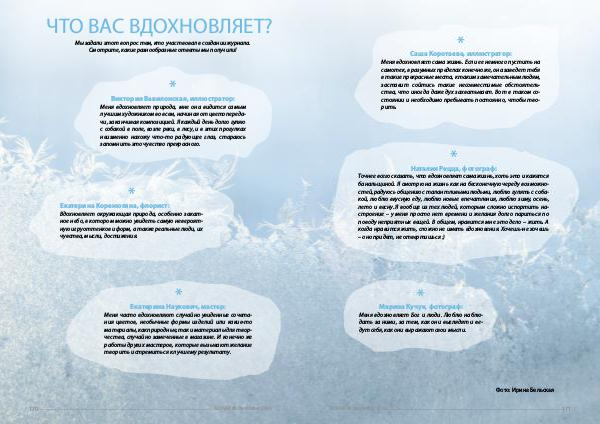Точнее всего сказать, что вдохновляет сама жизнь, хоть это и кажется банальщиной. Я смотрю на жизнь как на бесконечную череду возможностей, радуюсь общению с талантливыми людьми, люблю гулять с собакой, люблю вкусную еду, люблю новые впечатления, люблю зиму, осень, лето и весну. Я вообще из тех людей, которым сложно испортить настроение – у меня просто нет времени и желания долго париться по поводу неприятных вещей. В общем, нравится мне это дело – жить. А когда нравится жить, сложно не иметь вдохновения. Хочешь-не хочешь – оно придет, не отвертишься:)