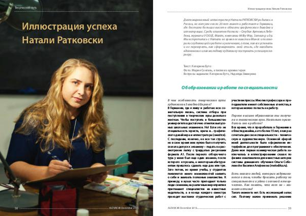В чем особенность творческого пути художника в Западной Европе? В Германии, где я живу и работаю всю сознательную жизнь, система отбора при поступлении в творческие вузы довольно жесткая. Чтобы поступить в большинство университетов достаточно отметок выпускных школьных экзаменов. Но! Если это не специальность юриста, врача и... графического дизайнера и иллюстратора( смеётся). С последним, конечно, не все так строго, но в свое время мне нужно было получить сначала допуск к экзамену – подать на рассмотрение папку с тридцатью рисунками формата А1. После первого отборочного тура у меня был еще один экзамен, после которого я прошла, а некоторым абитуриентам пришлось сдавать еще два или три. Зато потом, во время учебы, у студентов появляется много возможностей заявить о себе и завязать полезные знакомства. К примеру, в вузах часто преподают только люди с именем, на различные мероприятия приглашают специалистов из известных издательств, а в конце каждого семестра проходят выставки студенческих работ с участием прессы. Многие профессора и преподаватели имеют собственные агентства, в которые можно попасть на работу.