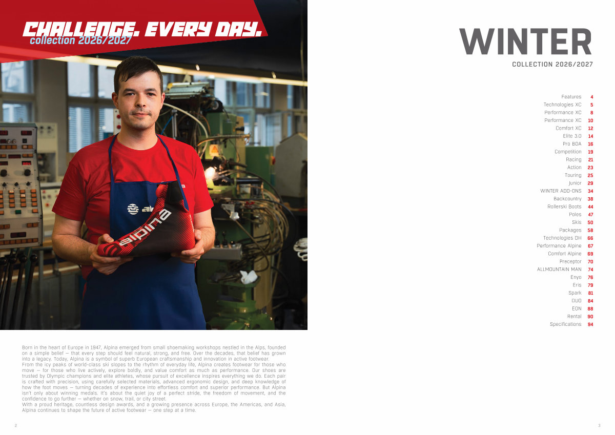 Born in the heart of Europe in 1947, Alpina emerged from small shoemaking workshops nestled in the Alps, founded on a simple belief— that every step should feel natural, strong, and free. Over the decades, that belief has grown into a legacy. Today, Alpina is a symbol of superb European craftsmanship and innovation in active footwear. From the icy peaks of world-class ski slopes to the rhythm of everyday life, Alpina creates footwear for those who move— for those who live actively, explore boldly, and value comfort as much as performance. Our shoes are trusted by Olympic champions and elite athletes, whose pursuit of excellence inspires everything we do. Each pair is crafted with precision, using carefully selected materials, advanced ergonomic design, and deep knowledge of how the foot moves— turning decades of experience into effortless comfort and superior performance. But Alpina isn’ t only about winning medals. It’ s about the quiet joy of a perfect stride, the freedom of movement, and the confidence to go further— whether on snow, trail, or city street. With a proud heritage, countless design awards, and a growing presence across Europe, the Americas, and Asia, Alpina continues to shape the future of active footwear— one step at a time.
