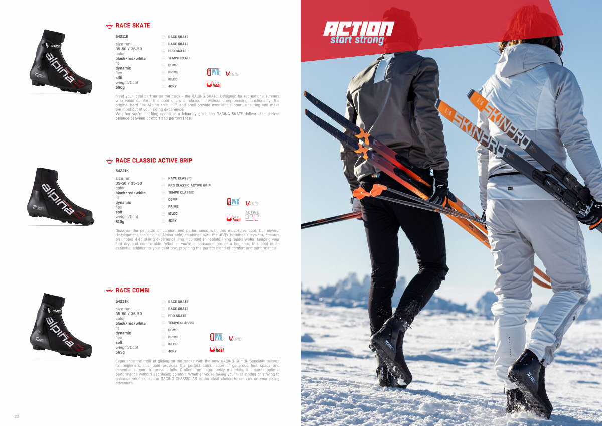 Experience the thrill of gliding on the tracks with the new RACING COMBI. Specially tailored for beginners, this boot provides the perfect combination of generous foot space and essential support to prevent falls. Crafted from high-quality materials, it ensures optimal performance without sacrificing comfort. Whether you ' re taking your first strides or striving to enhance your skills, the RACING CLASSIC AS is the ideal choice to embark on your skiing adventure.