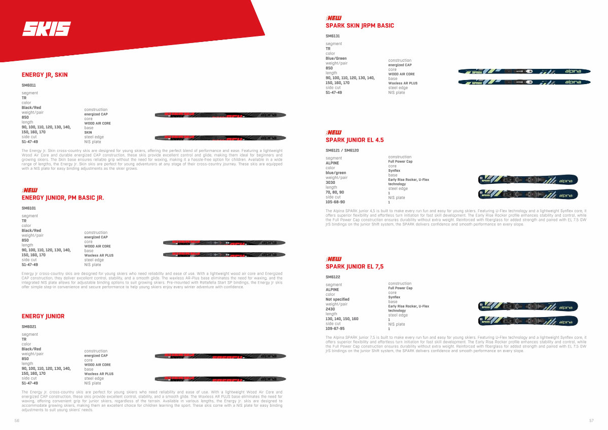 The Energy Jr. Skin cross-country skis are designed for young skiers, offering the perfect blend of performance and ease. Featuring a lightweight Wood Air Core and durable energized CAP construction, these skis provide excellent control and glide, making them ideal for beginners and growing skiers. The Skin base ensures reliable grip without the need for waxing, making it a hassle-free option for children. Available in a wide range of lengths, the Energy Jr. Skin skis are perfect for young adventurers at any stage of their cross-country journey. These skis are equipped with a NIS plate for easy binding adjustments as the skier grows.