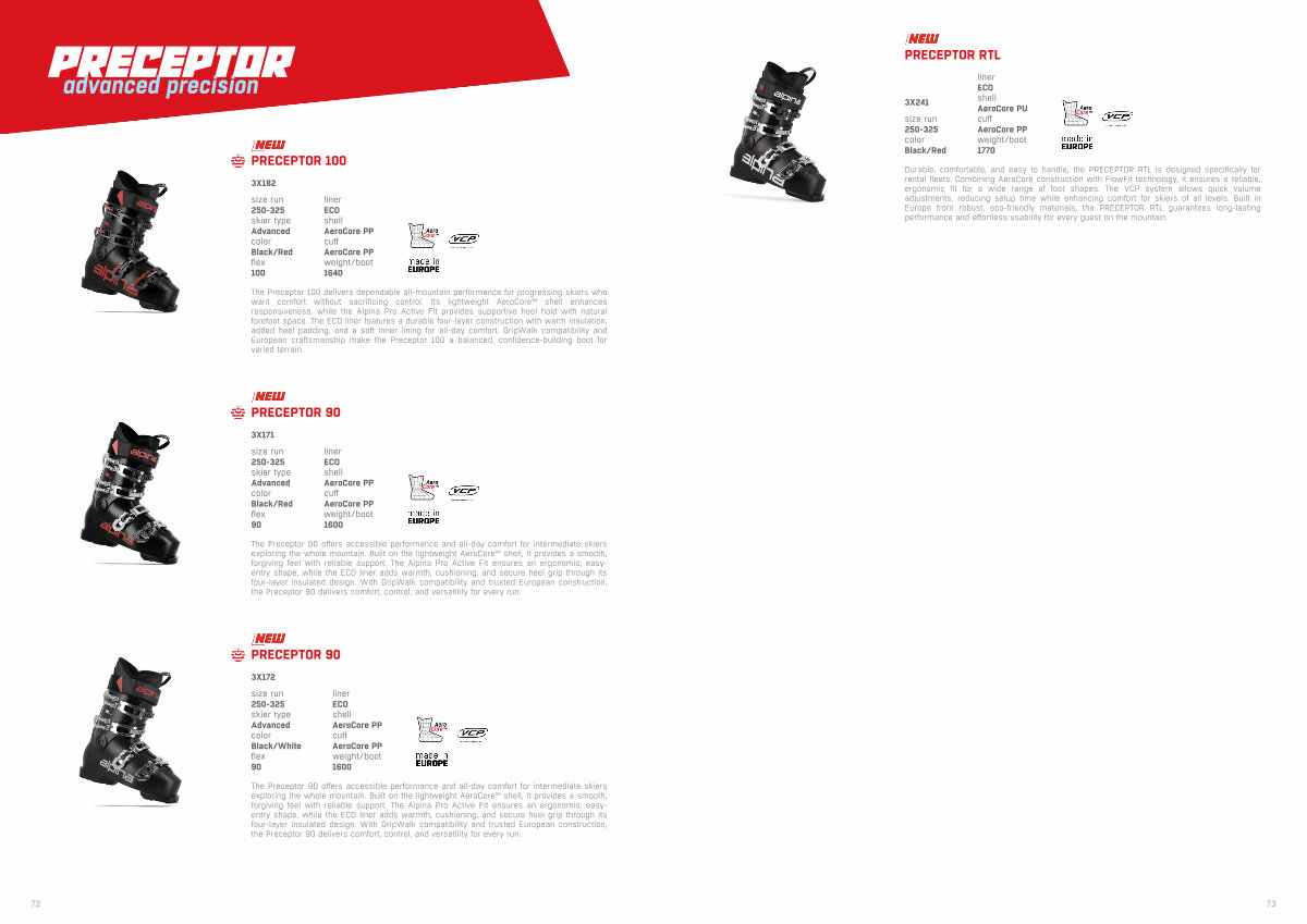 The Preceptor 100 delivers dependable all-mountain performance for progressing skiers who want comfort without sacrificing control. Its lightweight AeroCore™ shell enhances responsiveness, while the Alpina Pro Active Fit provides supportive heel hold with natural forefoot space. The ECO liner features a durable four-layer construction with warm insulation, added heel padding, and a soft inner lining for all-day comfort. GripWalk compatibility and European craftsmanship make the Preceptor 100 a balanced, confidence-building boot for varied terrain.