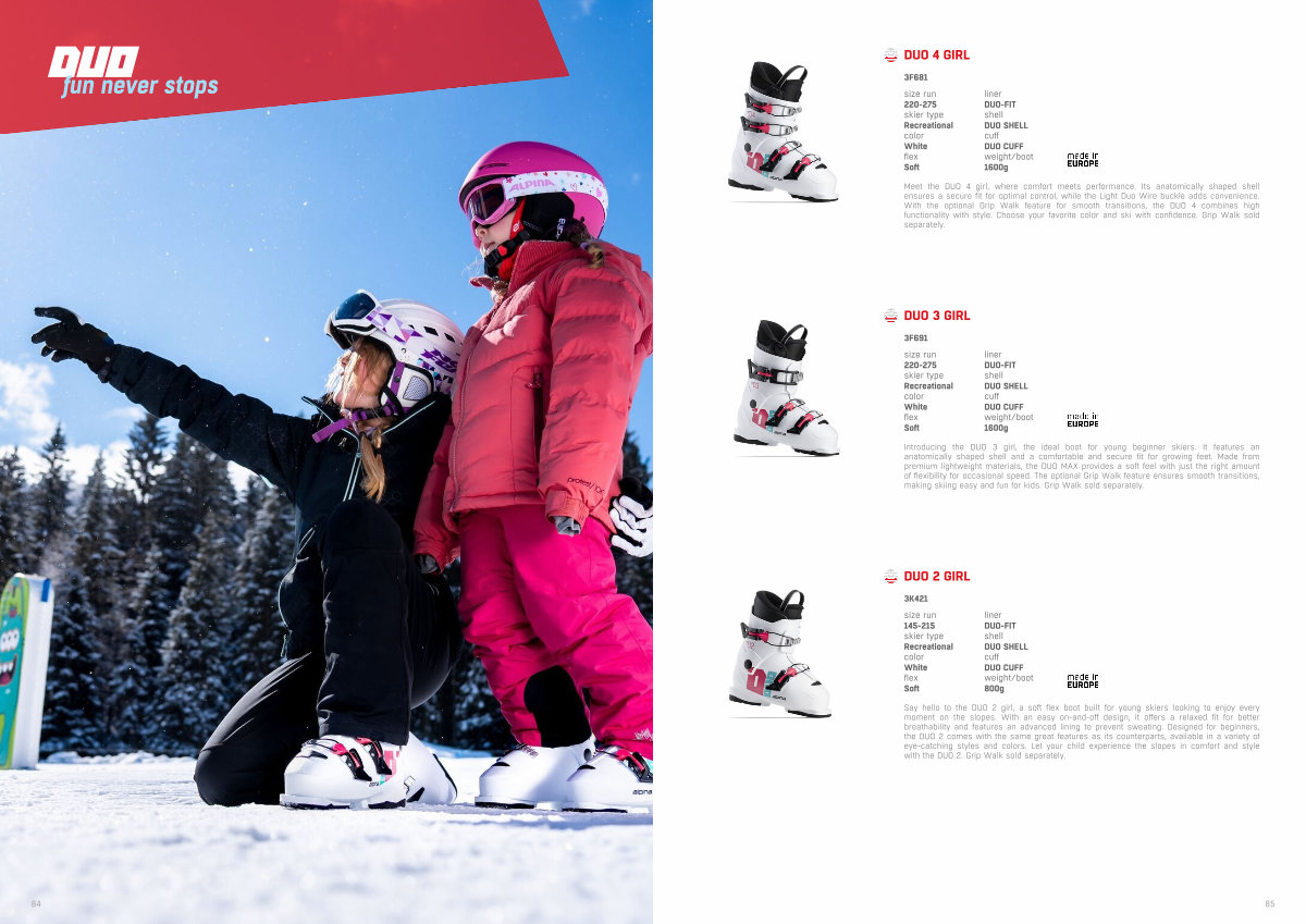 Introducing the DUO 3 girl, the ideal boot for young beginner skiers. It features an anatomically shaped shell and a comfortable and secure fit for growing feet. Made from premium lightweight materials, the DUO MAX provides a soft feel with just the right amount of flexibility for occasional speed. The optional Grip Walk feature ensures smooth transitions, making skiing easy and fun for kids. Grip Walk sold separately.
