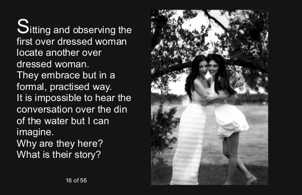 Sitting and observing the first over dressed woman locate another over dressed woman. They embrace but in a formal, practised way. It is impossible to hear the conversation over the din of the water but I can imagine. Why are they here? What is their story?