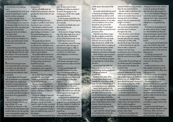 With that, Angus started towards the roaring ocean, his grandmother's dead body still paddling and rowing gracefully right beneath the surface of the waves. Ronald and Anstice summoned him back, but he only heard , glorious bagpipes had infused his mind and he knew she was content. The ice cold grip of the sea took his legs, then his waist, but still he bore forward. He would swim with his grandmother. No joy could trump swimming with his grandmother one last time.