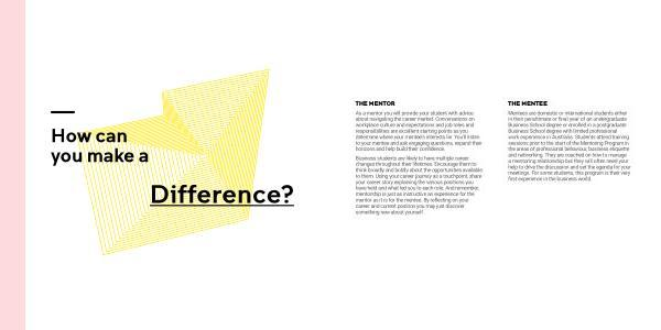 Mentees are domestic or international students either in their penultimate or final year of an undergraduate Business School degree or enrolled in a postgraduate Business School degree with limited professional work experience in Australia . Students attend training sessions prior to the start of the Mentoring Program in the areas of professional behaviour , business etiquette and networking . They are coached on how to manage a mentoring relationship but they will often need your help to drive the discussion and set the agenda for your meetings . For some students , this program is their very first experience in the business world .
