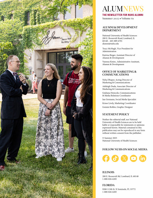 Neither the editorial staff, nor National University of Health Sciences are to be held liable or responsible for statements or opinions expressed herein. Material contained in this publication may not be reproduced in any form without written consent from the publisher.
