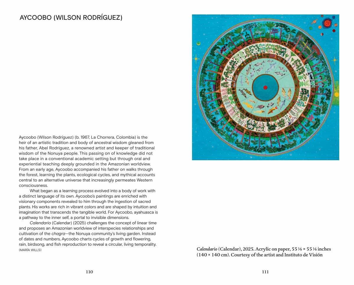 Calendario( Calendar)( 2025) challenges the concept of linear time and proposes an Amazonian worldview of interspecies relationships and cultivation of the chagra— the Nonuya community’ s living garden. Instead of dates and numbers, Aycoobo charts cycles of growth and flowering, rain, birdsong, and fish reproduction to reveal a circular, living temporality.
