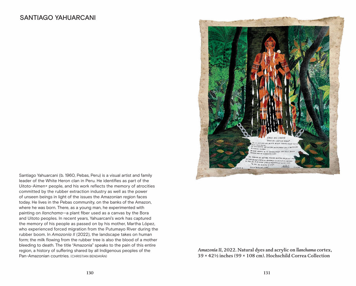 Santiago Yahuarcani( b. 1960, Pebas, Peru) is a visual artist and family leader of the White Heron clan in Peru. He identifies as part of the Uitoto-Aimen + people, and his work reflects the memory of atrocities committed by the rubber extraction industry as well as the power of unseen beings in light of the issues the Amazonian region faces today. He lives in the Pebas community, on the banks of the Amazon, where he was born. There, as a young man, he experimented with painting on llanchama— a plant fiber used as a canvas by the Bora and Uitoto peoples. In recent years, Yahuarcani’ s work has captured the memory of his people as passed on by his mother, Martha López, who experienced forced migration from the Putumayo River during the rubber boom. In Amazonía II( 2022), the landscape takes on human form; the milk flowing from the rubber tree is also the blood of a mother bleeding to death. The title“ Amazonia” speaks to the pain of this entire region, a history of suffering shared by all Indigenous peoples of the Pan-Amazonian countries.( CHRISTIAN BENDAYÁN)