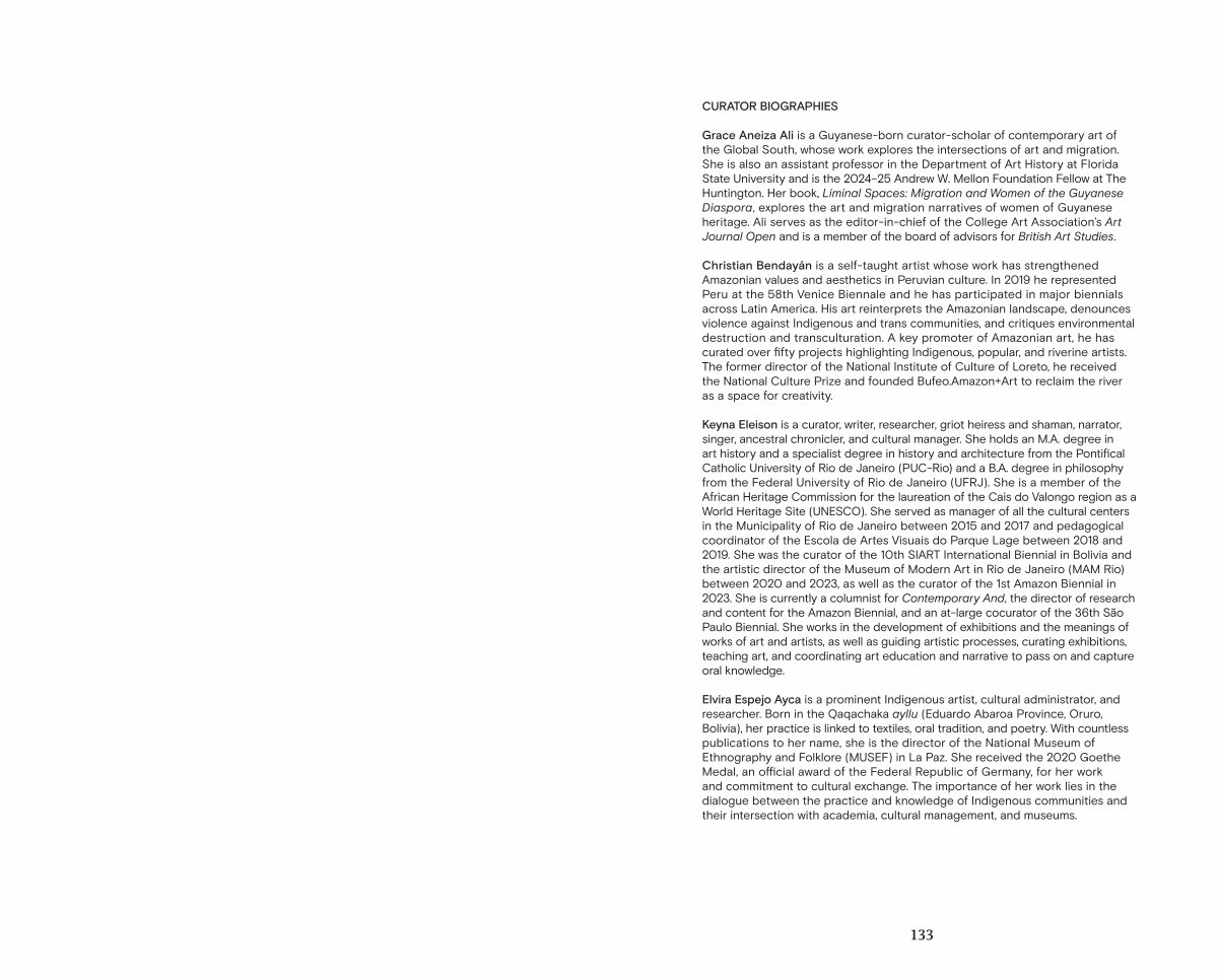 Keyna Eleison is a curator, writer, researcher, griot heiress and shaman, narrator, singer, ancestral chronicler, and cultural manager. She holds an M. A. degree in art history and a specialist degree in history and architecture from the Pontifical Catholic University of Rio de Janeiro( PUC-Rio) and a B. A. degree in philosophy from the Federal University of Rio de Janeiro( UFRJ). She is a member of the African Heritage Commission for the laureation of the Cais do Valongo region as a World Heritage Site( UNESCO). She served as manager of all the cultural centers in the Municipality of Rio de Janeiro between 2015 and 2017 and pedagogical coordinator of the Escola de Artes Visuais do Parque Lage between 2018 and 2019. She was the curator of the 10th SIART International Biennial in Bolivia and the artistic director of the Museum of Modern Art in Rio de Janeiro( MAM Rio) between 2020 and 2023, as well as the curator of the 1st Amazon Biennial in 2023. She is currently a columnist for Contemporary And, the director of research and content for the Amazon Biennial, and an at-large cocurator of the 36th São Paulo Biennial. She works in the development of exhibitions and the meanings of works of art and artists, as well as guiding artistic processes, curating exhibitions, teaching art, and coordinating art education and narrative to pass on and capture oral knowledge.