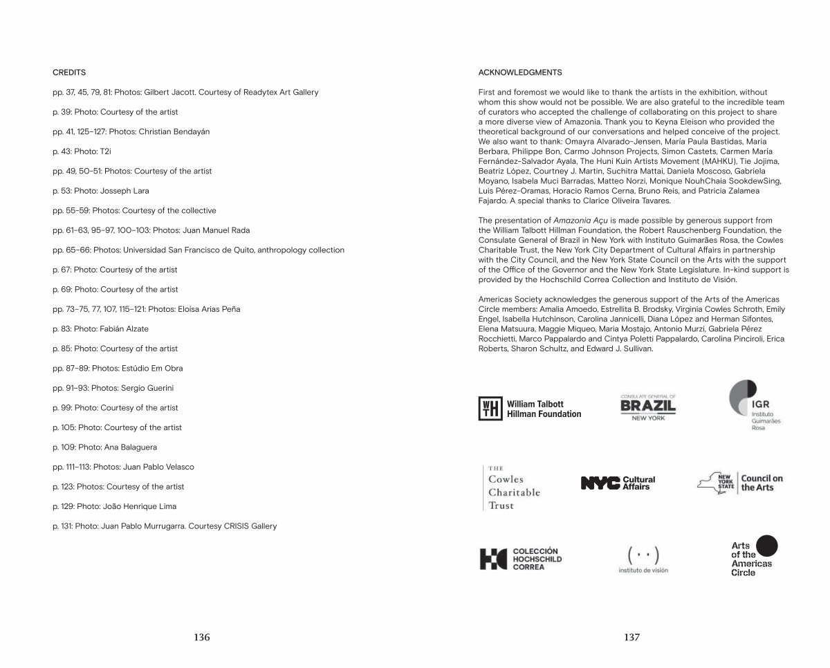 First and foremost we would like to thank the artists in the exhibition, without whom this show would not be possible. We are also grateful to the incredible team of curators who accepted the challenge of collaborating on this project to share a more diverse view of Amazonia. Thank you to Keyna Eleison who provided the theoretical background of our conversations and helped conceive of the project. We also want to thank: Omayra Alvarado-Jensen, María Paula Bastidas, Maria Berbara, Philippe Bon, Carmo Johnson Projects, Simon Castets, Carmen María Fernández-Salvador Ayala, The Huni Kuin Artists Movement( MAHKU), Tie Jojima, Beatriz López, Courtney J. Martin, Suchitra Mattai, Daniela Moscoso, Gabriela Moyano, Isabela Muci Barradas, Matteo Norzi, Monique NouhChaia SookdewSing, Luis Pérez-Oramas, Horacio Ramos Cerna, Bruno Reis, and Patricia Zalamea Fajardo. A special thanks to Clarice Oliveira Tavares.