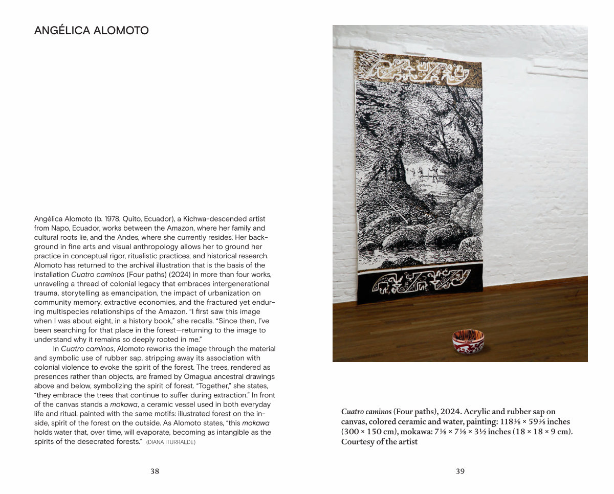 Cuatro caminos( Four paths), 2024. Acrylic and rubber sap on canvas, colored ceramic and water, painting: 118 1 ⁄ 8 × 59 1 ⁄ 8 inches( 300 × 150 cm), mokawa: 7 1 ⁄ 8 × 7 1 ⁄ 8 × 3 ½ inches( 18 × 18 × 9 cm). Courtesy of the artist