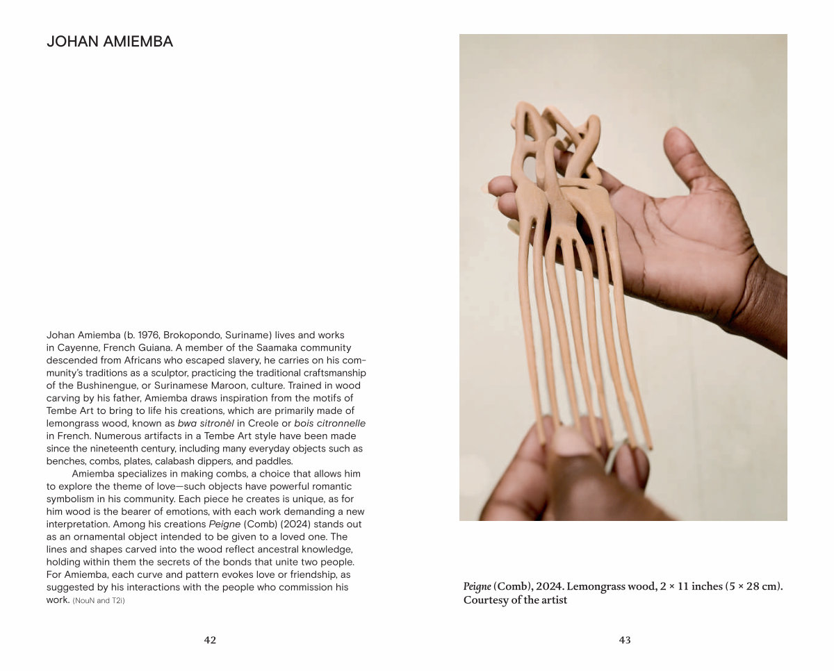 Johan Amiemba( b. 1976, Brokopondo, Suriname) lives and works in Cayenne, French Guiana. A member of the Saamaka community descended from Africans who escaped slavery, he carries on his community’ s traditions as a sculptor, practicing the traditional craftsmanship of the Bushinengue, or Surinamese Maroon, culture. Trained in wood carving by his father, Amiemba draws inspiration from the motifs of Tembe Art to bring to life his creations, which are primarily made of lemongrass wood, known as bwa sitronèl in Creole or bois citronnelle in French. Numerous artifacts in a Tembe Art style have been made since the nineteenth century, including many everyday objects such as benches, combs, plates, calabash dippers, and paddles.