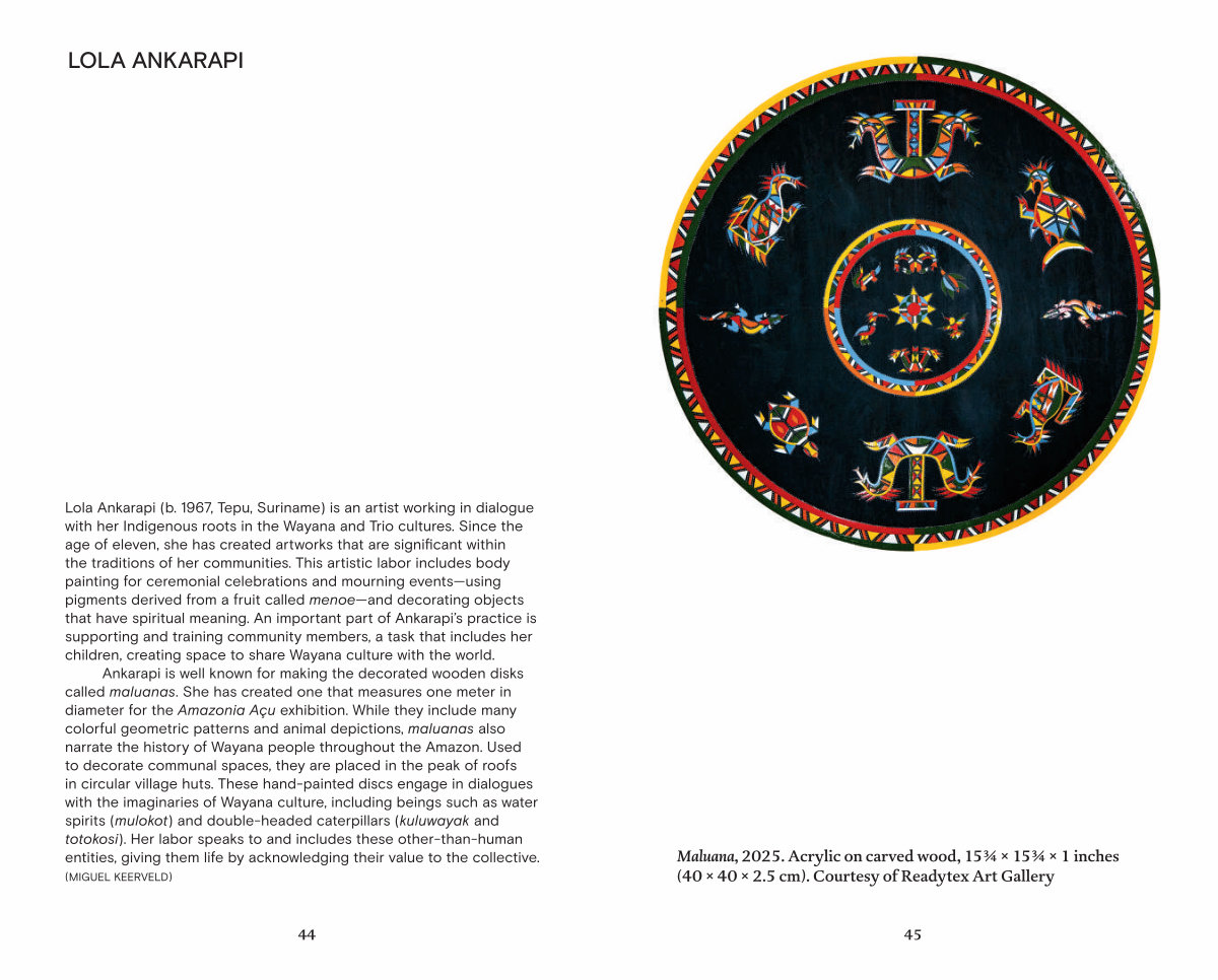 Ankarapi is well known for making the decorated wooden disks called maluanas. She has created one that measures one meter in diameter for the Amazonia Açu exhibition. While they include many colorful geometric patterns and animal depictions, maluanas also narrate the history of Wayana people throughout the Amazon. Used to decorate communal spaces, they are placed in the peak of roofs in circular village huts. These hand-painted discs engage in dialogues with the imaginaries of Wayana culture, including beings such as water spirits( mulokot) and double-headed caterpillars( kuluwayak and totokosi). Her labor speaks to and includes these other-than-human entities, giving them life by acknowledging their value to the collective.
