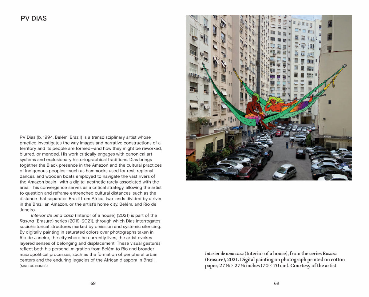 PV Dias( b. 1994, Belém, Brazil) is a transdisciplinary artist whose practice investigates the way images and narrative constructions of a territory and its people are formed— and how they might be reworked, blurred, or mended. His work critically engages with canonical art systems and exclusionary historiographical traditions. Dias brings together the Black presence in the Amazon and the cultural practices of Indigenous peoples— such as hammocks used for rest, regional dances, and wooden boats employed to navigate the vast rivers of the Amazon basin— with a digital aesthetic rarely associated with the area. This convergence serves as a critical strategy, allowing the artist to question and reframe entrenched cultural distances, such as the distance that separates Brazil from Africa, two lands divided by a river in the Brazilian Amazon, or the artist’ s home city, Belém, and Rio de Janeiro.