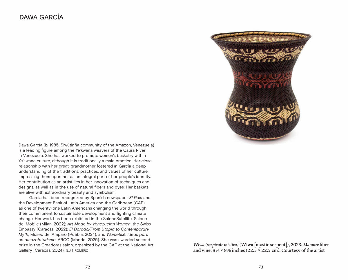 Dawa García( b. 1985, Siwütinña community of the Amazon, Venezuela) is a leading figure among the Ye ' kwana weavers of the Caura River in Venezuela. She has worked to promote women’ s basketry within Ye ' kwana culture, although it is traditionally a male practice. Her close relationship with her great-grandmother fostered in García a deep understanding of the traditions, practices, and values of her culture, impressing them upon her as an integral part of her people’ s identity. Her contribution as an artist lies in her innovation of techniques and designs, as well as in the use of natural fibers and dyes. Her baskets are alive with extraordinary beauty and symbolism.