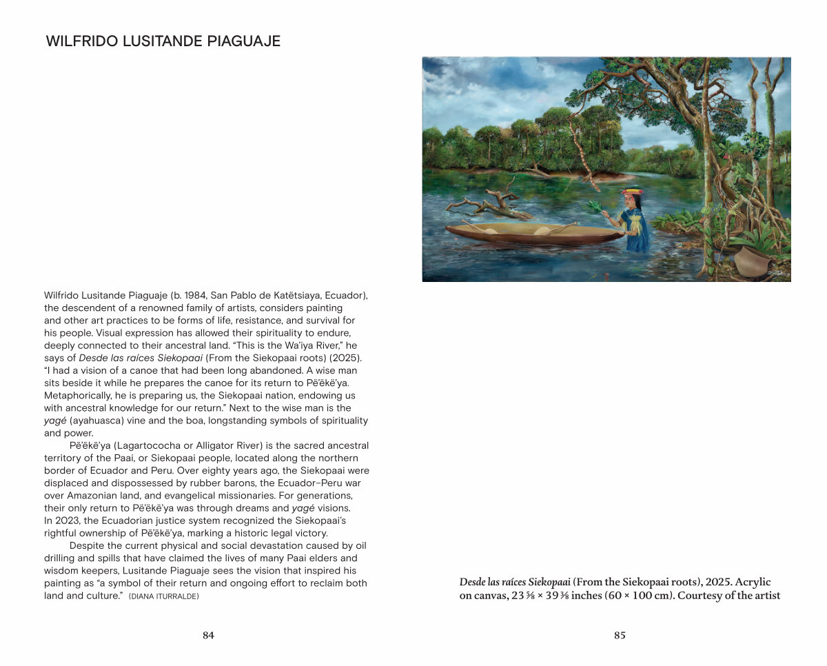 Wilfrido Lusitande Piaguaje( b. 1984, San Pablo de Katëtsiaya, Ecuador), the descendent of a renowned family of artists, considers painting and other art practices to be forms of life, resistance, and survival for his people. Visual expression has allowed their spirituality to endure, deeply connected to their ancestral land.“ This is the Wa’ iya River,” he says of Desde las raíces Siekopaai( From the Siekopaai roots)( 2025).“ I had a vision of a canoe that had been long abandoned. A wise man sits beside it while he prepares the canoe for its return to Pë’ ëkë’ ya. Metaphorically, he is preparing us, the Siekopaai nation, endowing us with ancestral knowledge for our return.” Next to the wise man is the yagé( ayahuasca) vine and the boa, longstanding symbols of spirituality and power.