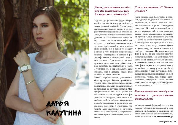 Задолго до увлечения фуд-фотографией я занималась портретной и художественной съёмкой. Тогда меня интересовали только люди, с их характерами и выражениями эмоций на лице, которые порой сложно уловить для снимка. Мне нравилось ловить их настроение, поддерживать общение в процессе съёмки, создавать между нами зрительный и эмоциональный контакт. Но в какой-то момент я поняла, что вопреки имеющемуся мнению, мастерства и желания фотографа создать интересный снимок недостаточно. Для удачного снимка нужна модель, умеющая работать перед камерой, расслабляться и быть естественной, а не сковывать себя страхом, как в детстве после слов « сейчас вылетит птичка ». Моим параллельным увлечением была кулинария. Видно, судьбе было угодно пересечь, казалось бы, две параллельные прямые, поменяв живых персонажей на вкусные модели. Мой профессиональный рост резко пошёл вверх после конкурса « Фуд-фотоигра » в Instagram, став одним из победителей, я обрела уверенность в своём творчестве и расширила его границы для себя. Я счастлива, что теперь мои увлечения и интересы полностью совпадают с направлением моей профессиональной деятельности.