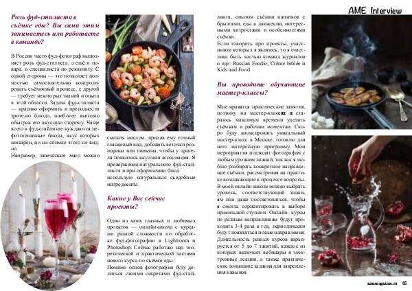 линга, опытом съёмки напитков с брызгами, еды в движении, интересными хитростями и особенностями съёмки. Если говорить про проекты, участником которых я являюсь, то я счастлива быть частью команд журналов о еде: Russian Foodie, Crème brûlée и Kids and Food.