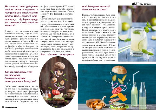 В первую очередь делать красивые интересные снимки, стараясь вкладывать что-то своё, а не копировать чужие работы. Привлечь внимание к своему аккаунту в соцсети. На данный момент самая популярная среди фуд-фотографов— Instagram. Не стесняться размещать свои контакты, чтобы к вам смогли обратиться в случае коммерческой съёмки. Не бояться самим предлагать услуги заказчикам, первое время, возможно, за бартер или взаимную рекламу. Активно принимать участие в тематических конкурсах и фуд- марафонах в Instagram. профиль стал интересен 4000 людям! Меня этот факт необычайно вдохновил, я продолжила снимать и общаться в кругу фуд-фотографов и фуд-блогеров. Сейчас моя аудитория составляет более 14 тысяч человек. Я не люблю слово « популярность », от него веет обособленностью и неким превосходством. Мне приятно, что людям интересно смотреть на мои работы и читать мои тексты. Я считаю, что в творчестве без обратной связи возникает застой. Если бы не все эти люди, которые подписываются на мой профиль, ставят сердечки и пишут комментарии, моего творчества не существовало бы в том проявлении, в котором его можно видеть сейчас.