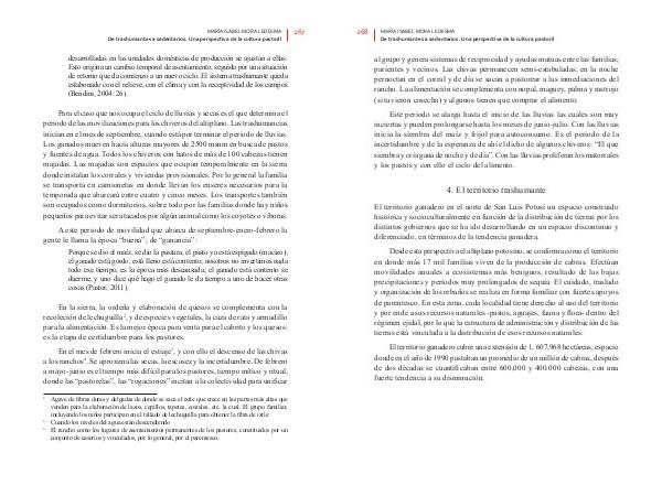 267 desarrolladas en las unidades domésticas de producción se ajustan a ellas. Esto origina un cambio temporal de asentamiento, seguido por una situación de retorno que da comienzo a un nuevo ciclo. El sistema trashumante queda eslabonado con el relieve, con el clima y con la receptividad de los campos( Bendini, 2004: 26).