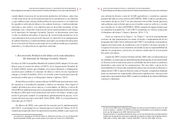 77 venido dando el proceso de reconversión productiva del tabaco, cómo han vivido ese proceso de reconversión productiva los productores y sus familias y, qué cambios traen consigo dicha política de reconversión y / o la reducción de superficie cultivada de tabaco a los saberes histórica y tradicionalmente asociados a este cultivo. Los objetivos que en un primer momento se han planteado, son: i) describir el proceso de reconversión productiva del tabaco en el municipio de Santiago Ixcuintla, Nayarit; ii) documentar cómo han vivido las familias del tabaco el proceso de reconversión productiva en la zona tabacalera de la costa norte de Nayarit; iii) describir la re-configuración de saberes históricos y tradicionalmente asociados a la producción tabacalera de la costa norte de Nayarit como parte de los cambios traídos por la política antitabaco y la reducción de la superficie cultivada.