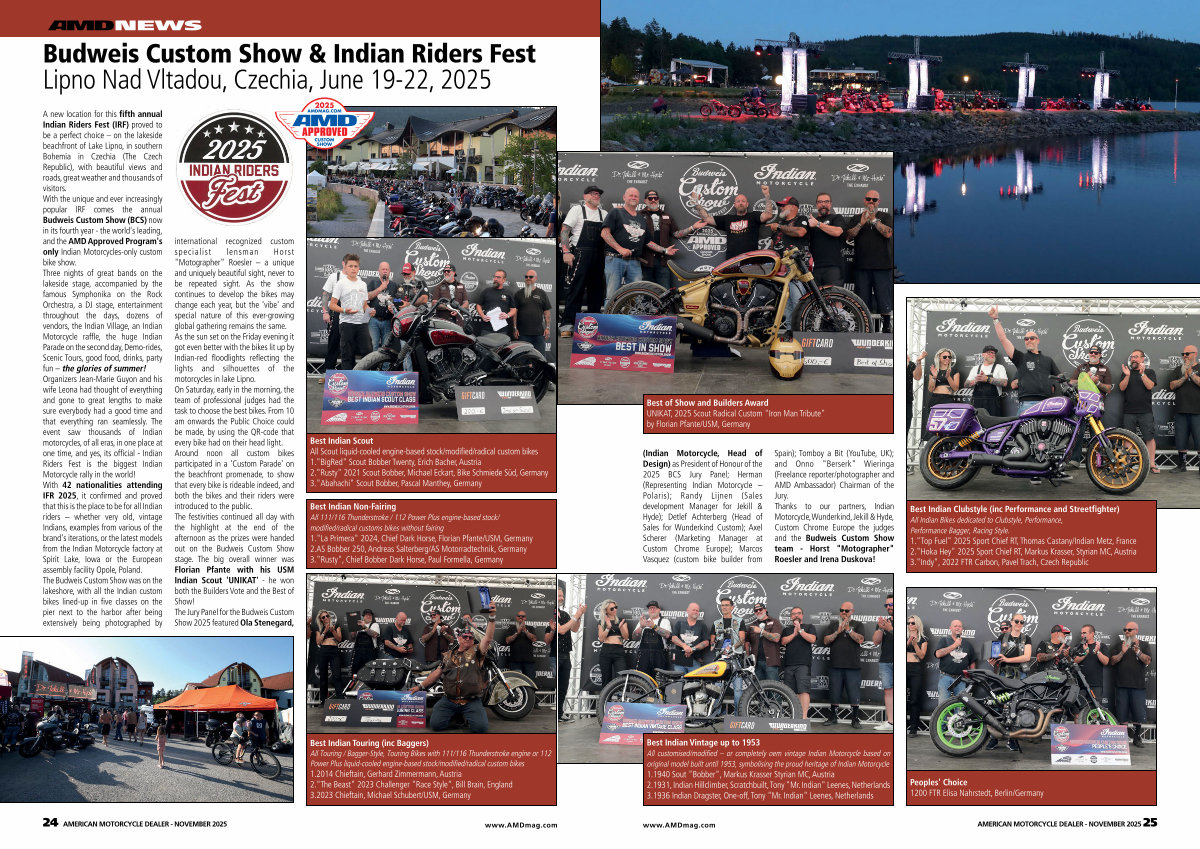 A new location for this fifth annual Indian Riders Fest( IRF) proved to be a perfect choice – on the lakeside beachfront of Lake Lipno, in southern Bohemia in Czechia( The Czech Republic), with beautiful views and roads, great weather and thousands of visitors. With the unique and ever increasingly popular IRF comes the annual Budweis Custom Show( BCS) now in its fourth year- the world ' s leading, and the AMD Approved Program ' s only Indian Motorcycles-only custom bike show. Three nights of great bands on the lakeside stage, accompanied by the famous Symphonika on the Rock Orchestra, a DJ stage, entertainment throughout the days, dozens of vendors, the Indian Village, an Indian Motorcycle raffle, the huge Indian Parade on the second day, Demo-rides, Scenic Tours, good food, drinks, party fun – the glories of summer! Organizers Jean-Marie Guyon and his wife Leona had thought of everything and gone to great lengths to make sure everybody had a good time and that everything ran seamlessly. The event saw thousands of Indian motorcycles, of all eras, in one place at one time, and yes, its official- Indian Riders Fest is the biggest Indian Motorcycle rally in the world! With 42 nationalities attending IFR 2025, it confirmed and proved that this is the place to be for all Indian riders – whether very old, vintage Indians, examples from various of the brand ' s iterations, or the latest models from the Indian Motorcycle factory at Spirit Lake, Iowa or the European assembly facility Opole, Poland. The Budweis Custom Show was on the lakeshore, with all the Indian custom bikes lined-up in five classes on the pier next to the harbor after being extensively being photographed by international recognized custom specialist lensman Horst " Motographer " Roesler – a unique and uniquely beautiful sight, never to be repeated sight. As the show continues to develop the bikes may change each year, but the ' vibe ' and special nature of this ever-growing global gathering remains the same. As the sun set on the Friday evening it got even better with the bikes lit up by Indian-red floodlights reflecting the lights and silhouettes of the motorcycles in lake Lipno. On Saturday, early in the morning, the team of professional judges had the task to choose the best bikes. From 10 am onwards the Public Choice could be made, by using the QR-code that every bike had on their head light. Around noon all custom bikes participated in a ' Custom Parade ' on the beachfront promenade, to show that every bike is rideable indeed, and both the bikes and their riders were introduced to the public. The festivities continued all day with the highlight at the end of the afternoon as the prizes were handed out on the Budweis Custom Show stage. The big overall winner was Florian Pfante with his USM Indian Scout ' UNIKAT '- he won both the Builders Vote and the Best of Show! The Jury Panel for the Budweis Custom Show 2025 featured Ola Stenegard,