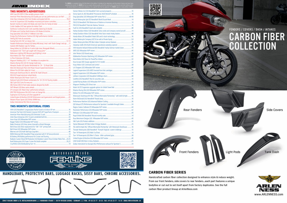 AIM Corp( US) SDR V2 Max variable pressure clutch.......................................................... 20 American Prime Manufacturing( US) Quality you can see, performance you can feel!.......... 22 Arlen Ness Enterprises( US) Front fenders and engine bolt kits...................................... 19,47 Arnott Air Suspension( US) Handlebar-mounted push button controllers.............................. 29 Barnett Clutches & Cables( US) Brake and clutch lines for Harley & Indian.......................... 37 Corbin Saddles( US) Seat options for Indian Chief................................................................ 11 Darkhorse Crankworks( US) Crank assembly balancing & rebuilds...................................... 48 DP Brakes and Clutches North America( US) Brakes & clutches............................................ 26 Drag Specialties( US) 2026-27 OldBook cover bike................................................................ 9 Energy One Performance Clutches( US) High performance clutches...................................... 6 Fehling( DE) Parts & accessories.......................................................................................... 46 Feuling Parts( US) ' BA ' air cleaner Slim.......................................................................... 12-13 Freedom Performance Exhaust( US) Harley M8 shorty 2-into1 with ' Dutch Orange ' end-cap.... 17 Gaslock( DE) Radiator caps for Harleys.................................................................................. 4 Hawg Halters Inc( US) Bolt-on X series triple trees, Renegade Wheels.................................. 43 Horsepower( US) " Don ' t get caught with cheap parts!"...................................................... 30 Kellermann Lighting( DE) Because good lighting is more...................................................... 6 Klock Werks( US) ' Flare ' windshields.................................................................................. 41 Le Pera Enterprises( US) Seats.............................................................................................. 39 Magnum Shielding( US) 1 1 / 4 " Handlebars & complete kits................................................ 18 Maxima Racing Oils( US) Oil change made easy.................................................................. 31 Memphis Shades( US) Spoiler Windshields for ' 24- ' 25 Road Glide.................................... 45 Mid-USA Motorcycle Parts( US) Power House 6 speed tansmissions.................................... 15 Motion Pro( US) Split cables for V-twin................................................................................ 26 Motorcycle Storehouse( NL) Dr. Jekill & Mr. Hyde Exhausts.................................................... 2 MSI( US) Forged aluminum wheel blanks............................................................................ 39 Müller Motorcycle( DE) Power Clutch 2.0............................................................................ 18 National Cycle( US) VStream windscreens for ' 24- ' 25 H-D Touring models.......................... 11 S & S Cycle( US) Cams for every era...................................................................................... 27 SBS Friction( DK) Hi-Tech brake solutions designed by Kodlin................................................ 7 SMT Wheels( US) Retro series wheels.................................................................................... 5 SP Concepts( US) ' Black Onyx ' performance exhausts.......................................................... 23 SPECTRO Performance Oils( US) V-twin oil change kits........................................................ 33 Supersprox( CZ) Touring cush drive upgrade kit.................................................................. 42 United Engine & Machine( US) KB Performance cast hypereutectic and forged pistons........ 45 Western Power Sports( US) Shinko SR999 tires.................................................................... 21 Zodiac International( NL) Parts & accessories...................................................................... 35
