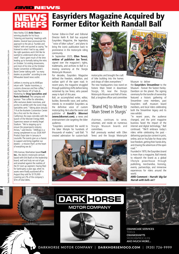 Museum to deliver the Easyriders Streamliner to the Museum- forever the fastest Harley- Davidson on the planet. The signing ceremony for the transfer of ownership featured a historic gathering of Streamliner crew members, past Easyriders staff, museum board members, and local riders celebrating both the Streamliner legacy and its new exhibit. " In recent years, the audience changed, and the print magazine business faced the impact of the internet and digital technology," Ball continued. " We ' ll embrace today ' s riders while celebrating the past- delivering spectacular content in print, online, and on YouTube for those who love freedom, getting their hands dirty, and chasing the adventure of the open road." Founded in 1970, the Easyriders brand is more than a magazine. Ball intends to relaunch the brand as a global lifestyle powerhouse through publishing, merchandise, licensing, events, partnerships, and immersive experiences for riders around the world. AMD Comment – Hurrah! Big fat Hurrah with bells on!!