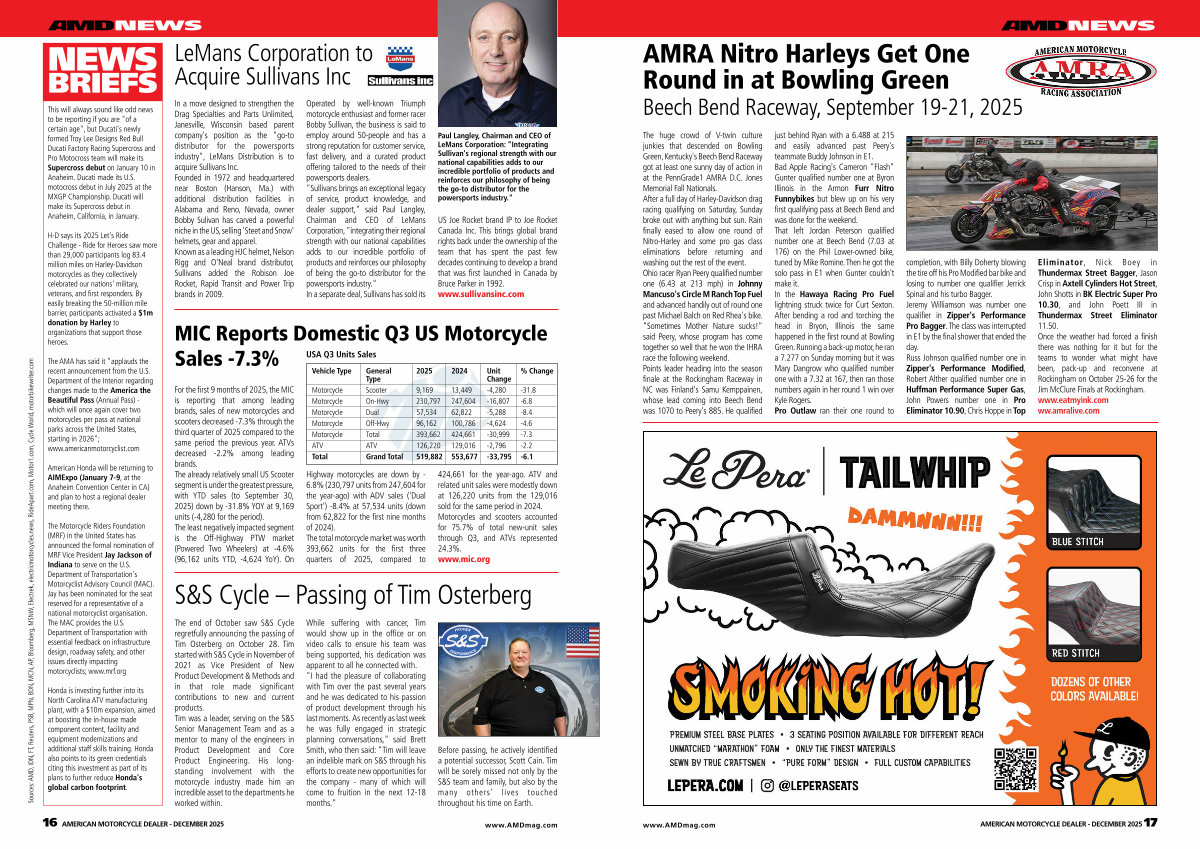 The huge crowd of V-twin culture junkies that descended on Bowling Green, Kentucky ' s Beech Bend Raceway got at least one sunny day of action in at the PennGrade1 AMRA D. C. Jones Memorial Fall Nationals. After a full day of Harley-Davidson drag racing qualifying on Saturday, Sunday broke out with anything but sun. Rain finally eased to allow one round of Nitro-Harley and some pro gas class eliminations before returning and washing out the rest of the event. Ohio racer Ryan Peery qualified number one( 6.43 at 213 mph) in Johnny Mancuso ' s Circle M Ranch Top Fuel and advanced handily out of round one past Michael Balch on Red Rhea ' s bike. " Sometimes Mother Nature sucks!" said Peery, whose program has come together so well that he won the IHRA race the following weekend. Points leader heading into the season finale at the Rockingham Raceway in NC was Finland ' s Samu Kemppainen, whose lead coming into Beech Bend was 1070 to Peery ' s 885. He qualified |