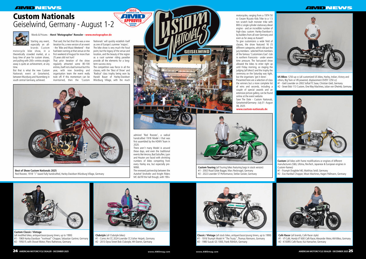 motorcycles, ranging from a 1974 50 cc Cesare Rizzato Kids Trike to a 1.5 ton scratch built monster trike with 800 cc single cylinder stationary diesel engine- and an incredible number of high-class custom Harley-Davidson ' s by builders from all over Germany and even as far away as Kuwait! To give customizers a wide field of classes, the show featured 16(!) different categories, which did put the jury members- selected from members of the famous ' Customizers East ' club in northern Franconia- under severe time pressure. The fast-paced show allowed the bikes to enter right up until Friday morning, so staging the judging( all bikes!) and the trophy the ceremony on the Saturday was tight, but the organisers ' got it done '. Presented here are a selection of class the winners but a more complete list of wins and seconds, including a couple of special awards and an extensive picture gallery, can be found online at the event website. Save The Date- Custom Nationals, Geiselwind / Germany- July 31- August 08, 2025 www. custom-nationals. de