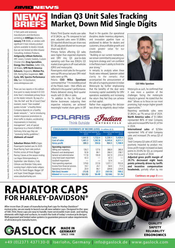 Motorcycle as such, he confirmed that it was more a question of the challenges facing the motorcycle industry in general. He stated that the deal " allows us to focus on our most promising, high margin higher growth opportunities." Reporting worldwide sales were $ 1,842m, up 7 % versus Q3 of 2024. North America sales of $ 1,586m represented 86 % of total Company sales and increased 8 % from $ 1,473m in 2024. International sales of $ 256m represented 14 % of total Company sales and increased 2 % versus Q3 of 2024. Total Company Q3 sales of 2025 were positively impacted by product mix. Gross profit margin increased six basis points to 20.6 % for Q3, as compared to the third quarter of 2024. Adjusted gross profit margin of 20.7 % decreased eight basis points primarily driven by tariffs and incentive compensation headwinds, partially offset by mix