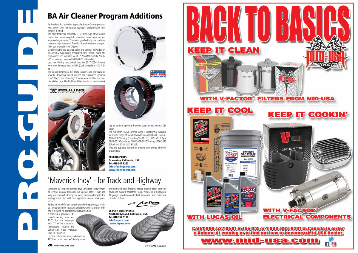 Parts has added to its popular BA Air Cleaner program with a new ' Slim ' fitment that has been " designed with rider comfort in mind." The ' Slim ' features a compact 2.375 " deep cage, offset toward the front of the motorcycle to provide increased leg room and improved ergonomics- " the redesigned velocity stack delivers the same high-volume air flow that riders have come to expect from our original BA Air Cleaner." Quickly established as a top seller, the original full-width BA was initially most closely associated with Center Cooled M8 applications and available for 2017-2024 M8 models, 2023 + VVT models and selected 2024-2025 M8 models. Last year Feuling announced that the 2017-2024 fitments were now 50 state legal in USA( Carb Compliant – EO # D- 881). The design lengthens the intake runners and increases air velocity, delivering added volume for " balanced dynamic flow ". They come with a high flow reusable air filter and onepiece billet cage. The highflow billet aluminum velocity stack