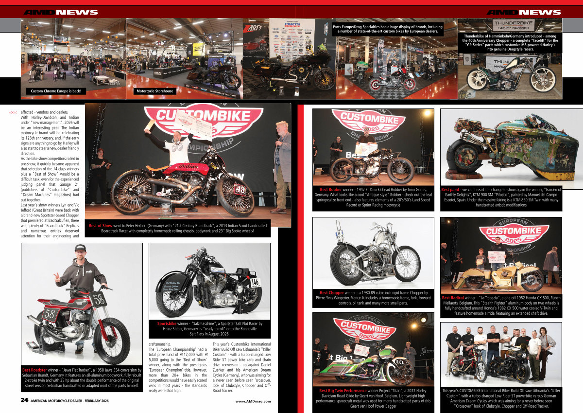 <<< affected- vendors and dealers. With Harley-Davidson and Indian under " new management ", 2026 will be an interesting year. The Indian motorcycle brand will be celebrating its 125th anniversary, and, if the early signs are anything to go by, Harley will also start to steer a new, dealer friendly direction. As the bike show competitors rolled in pre-show, it quickly became apparent that selection of the 14 class winners plus a " Best of Show " would be a difficult task, even for the experienced judging panel that Garage 21( publishers of " Custombike " and " Dream Machines " magazines) had put together. Last year ' s show winners Lyn and Vic Jefford( Great Britain) were back with a brand-new Sportster-based Chopper that premiered at Bad Salzuflen, there were plenty of " Boardtrack " Replicas and numerous entries deserved attention for their engineering and