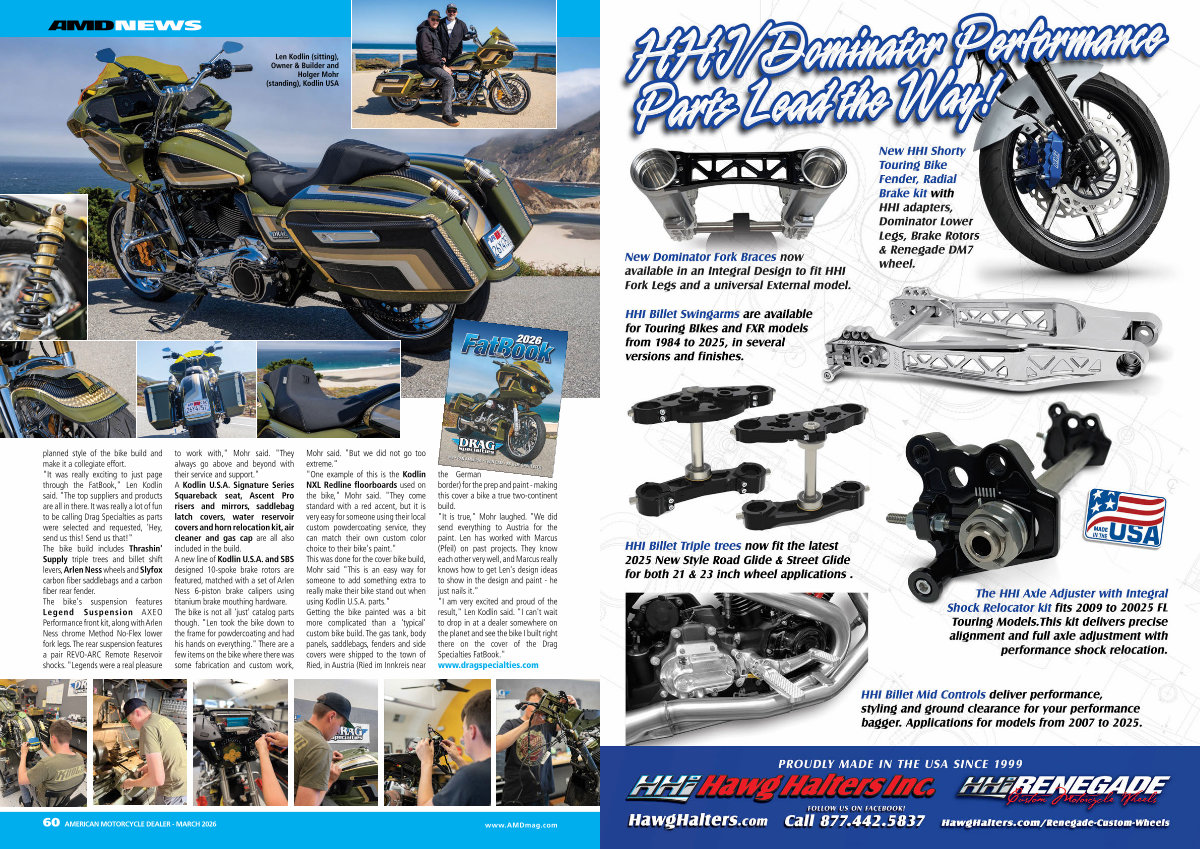 the German border) for the prep and paint- making this cover a bike a true two-continent build. " It is true," Mohr laughed. " We did send everything to Austria for the paint. Len has worked with Marcus( Pfeil) on past projects. They know each other very well, and Marcus really knows how to get Len ' s design ideas to show in the design and paint- he just nails it." " I am very excited and proud of the result," Len Kodlin said. " I can ' t wait to drop in at a dealer somewhere on the planet and see the bike I built right there on the cover of the Drag Specialties FatBook." www. dragspecialties. com |
