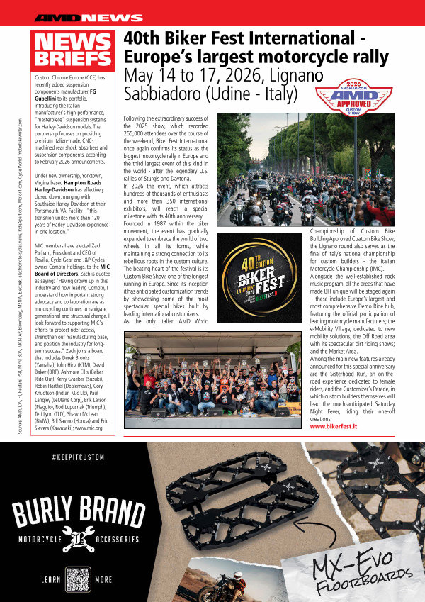 Following the extraordinary success of the 2025 show, which recorded 265,000 attendees over the course of the weekend, Biker Fest International once again confirms its status as the biggest motorcycle rally in Europe and the third largest event of this kind in the world- after the legendary U. S. rallies of Sturgis and Daytona. In 2026 the event, which attracts hundreds of thousands of enthusiasts and more than 350 international exhibitors, will reach a special milestone with its 40th anniversary. Founded in 1987 within the biker movement, the event has gradually expanded to embrace the world of two wheels in all its forms, while maintaining a strong connection to its rebellious roots in the custom culture. The beating heart of the festival is its Custom Bike Show, one of the longest running in Europe. Since its inception it has anticipated customization trends by showcasing some of the most spectacular special bikes built by leading international customizers. As the only Italian AMD World