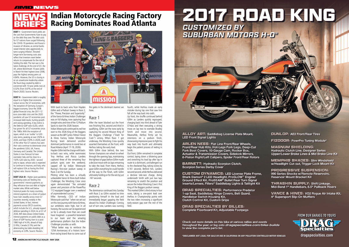 With back-to back wins from Hayden Gillim and a Podium Sweep in Race 2, the " Power, Precision and Superiority " of the Vance & Hines Indian Challenger was on full display, now capturing four straight wins and nine of the 12 Podium Spots to start the 2026 Season. Indian Motorcycle continued its red-hot start to the 2026 King of the Baggers season as the J & P Cycles / Motul / Vance & Hines Factory Indian Motorcycle Racing team delivered another dominant performance in round two at Road Atlanta( April 17-19, 2026). Hayden Gillim led the charge with backto-back race wins, while teammates Troy Herfoss and Rocco Landers captured three of the remaining four podium spots over the weekend, capped off by Indian Motorcycle Racing ' s first-ever podium sweep in Race 2 on the Sunday. Piloting what has been a virtually unbeatable Vance & Hines-built Indian Challenger, the Wrecking Crew once again demonstrated " the unrivaled power and precision of the PowerPlus 112-equipped bagger over a weekend of unprecedented success." Mike Kennedy, CEO of Indian Motorcycle said that " when we set out on this new journey with Vance & Hines, our ambitions were high, but in all honesty, the success we ' ve experienced so far is already more than we could have imagined- a powerful testament to our team and the amazing performance platform that the Indian Challenger provides us with. " What better way to reinforce the 125th Anniversary of a historic bornfrom-racing brand than to come out of |