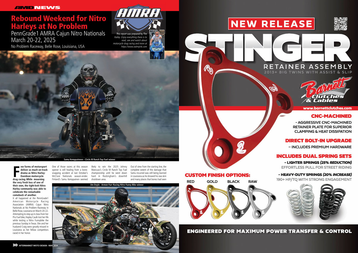 Few forms of motorsport deliver as much on-track drama as Nitro Harley- Davidson motorcycle drag racing. While mourning the very fresh loss of one of their own, the tight-knit Nitro Harley community was able to celebrate the remarkable comeback of another. It all happened at the PennGrade1 American Motorcycle Racing Association( AMRA) Cajun Nitro Nationals at No Problem Raceway in Belle Rose, Louisiana on March 20-22. Attempting to step up in class from her Pro Fuel bike, Hayley Caulk lost her life while testing a Nitro Funnybike the previous Sunday in Texas. She and her husband Craig were greatly missed in Louisiana as her fellow competitors raced in her honor.