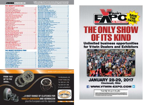 AIM Corp( US) Clutches & gear kits.................................................................................................................... 64 AirFX USA( US) Air suspension kits.................................................................................................................... 53 Arlen Ness Enterprises( US) Parts & accessories............................................................................................ 24,56 Arnott Air Suspension( US) Adjustable air suspension kits.................................................................................. 45 Badlands Motorcycle Products( US) Illuminator modules.................................................................................... 46 Barnett Clutches & Cables( US) Scorpion clutch basket...................................................................................... 46 Belt Drives Ltd( US) GMA forward controls, GMA floorboards, distributor network...................................... 5,42,61 Ciro( US) Parts & accessories............................................................................................................................ 6-7 Darkhorse Crankworks( US) Crank assembly balancing & rebuilds...................................................................... 55 Design Engineering Inc( DEI)( US) EXO Series exhaust wrap................................................................................ 59 DP Brakes and Clutches North America( US) Brakes & clutches.......................................................................... 42 Drag Specialties( US) Coastal Moto ' Largo ' wheels.............................................................................................. 9 Easyriders Events( US) V-Twin Expo 2017.......................................................................................................... 63 Fehling( DE) Parts & accessories........................................................................................................................ 59 Hawg Halters Inc( US) Calipers, triple trees, front ends........................................................................................ 11 James Gaskets( US) Derby cover gaskets, distributor network........................................................................ 43,60 Joker Machine( US) Vega turn signals................................................................................................................ 47 Kellermann( DE) Bullet 1000 series.................................................................................................................... 13 Kibblewhite Precision Machining Inc( US) Lead free spoke wheel weights.......................................................... 38 Kustom Tech( IT) Parts & accessories.................................................................................................................... 4 LePera Enterprises( US) Seats............................................................................................................................ 10 Lincoln Industries( US) StyleLinc Eclipse exhaust................................................................................................ 14 Mag Connection( FR) Distributor........................................................................................................................ 31 Metalsport Wheels( US) Wheels........................................................................................................................ 29 Mid-USA Motorcycle Parts( US) Parts & accessories............................................................................................ 52 Midwest Motorcycle Supply( US) Ultima front ends............................................................................................ 57 Motorcycle Storehouse( NL) Distributor, International Sales Offices.......................................................... 38-39,60 NAMZ Custom Cycle Products( US) Wiring harnesses & fluid lines........................................................................ 8 National Cycle( US) Windshields and accessories................................................................................................ 40 Pickard USA( US) Precision fit- Swag bag rear end packages.............................................................................. 39 Renegade Wheels( US) ' Tahoe ' wheel and range................................................................................................ 21 Rivera Primo( US) Gear Ratio Game Changer...................................................................................................... 21 S & S Cycle( US) Cam Chest kits.......................................................................................................................... 48 SBS Friction( DK) SBS brake pads........................................................................................................................ 52 SDL Exhibitions( IE) Dublin Show........................................................................................................................ 64 Spectro Oils of America( US) Premium-quality lubricants.................................................................................... 40 Speed-Way Shelters( US) Shelters, distributors.................................................................................................... 58 Surflex( IT) Clutches for Harley-Davidson............................................................................................................ 62 Tech Cycle Performance Products( US) Belt drives & starters................................................................................ 46 TecMate International( BE) OptiMATE Select chargers.......................................................................................... 5 Truett & Osborn Cycle( US) Stroker pistons for Harley 45 ' s.........................................................................