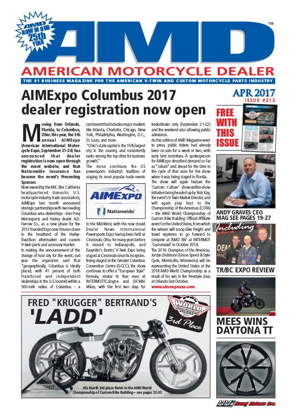 in the Mid-West, with the now closed Dealer News International Powersports Expo having been held at Cincinnati, Ohio, for many years before it moved to Indianapolis, and Easyrider’ s Events’ V-Twin Expo being staged at Cincinnati since its inception. Being staged at the Greater Columbus Convention Centre( GCCC), the show continues to offer a“ European Style” formula, similar to that seen at INTERMOT / Cologne and EICMA / Milan, with the first two days for trade / dealer only( September 21-22) and the weekend also allowing public admission. As this edition of AMD Magazine went to press, public tickets had already been on sale for a week or two, with early bird incentives. A spokesperson for AIMExpo described demand so far as“ robust” and ahead for the time in the cycle of that seen for the show when it was being staged in Florida. The show will again feature the‘ Custom Culture’ show-within-show initiative being headed up by Bob Kay, the event’ s V-Twin Market Director, and will again play host to the Championship of the Americas( COTA) – the AMD World Championship of Custom Bike Building Official Affiliate event for the United States, from which the winner will scoop bike freight and travel expenses to go forward to compete at‘ AMD XIII’ at INTERMOT‘ Customized’ in October 2018. The 2016 Champion of the Americas, Jordan Dickinson( Union Speed & Style Cycle, Monticello, Minnesota) will be representing the United States at the 2018 AMD World Championship as a result of his win in the Freestyle class at Orlando last October. www. aimexpousa. com