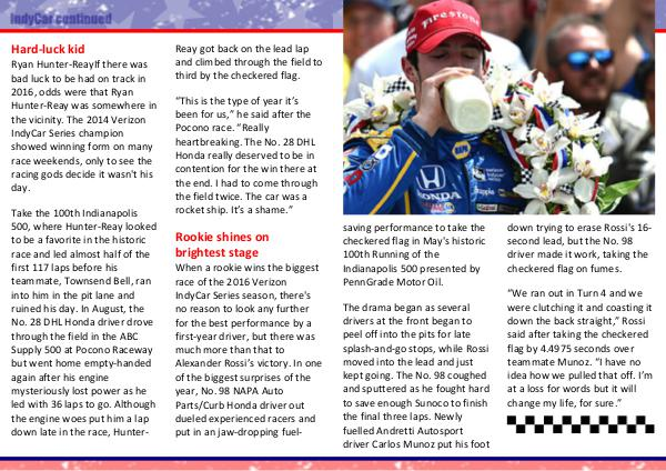 Ryan Hunter-ReayIf there was bad luck to be had on track in 2016, odds were that Ryan Hunter-Reay was somewhere in the vicinity. The 2014 Verizon IndyCar Series champion showed winning form on many race weekends, only to see the racing gods decide it wasn ' t his day.
