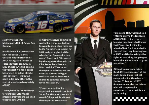 Gilliland joins owner-driver Busch( five races) as part of the multi-driver lineup that will compete behind the wheel of the No. 51 Tundra in 2017. Announcements for the drivers who will complete the remainder of the schedule are forthcoming.