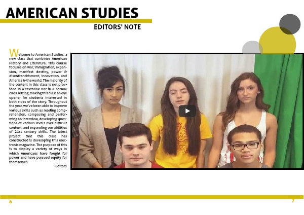 sion, manifest destiny, power & disenfranchisment, innovation, and America & the world. The majority of the content in this class is not prov-ided in a textbook nor in a normal class setting, making this class an eye opener for students interested in both sides of the story. Throughout the year, we’ve been able to improve various skills such as reading comp-rehension, composing and perfor-ming an interview, developing ques-tions of various levels over difficult content, and expanding our abilities of 21st century skills. The latest project that this class has constructed is developing this elec-tronic magazine. The purpose of this is to display a variety of ways in which Americans have fought for power and have pursued equity for themselves.