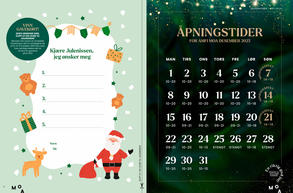 ÅPNINGSTIDER FOR AMFI MOA DESEMBER 2025 MAN 20 6 5 12 13 4 11 19 3 10 17 18 2 9 16 30 31 23 25 26 1 8 15 29 22 24 TIRS ONS TORS FRE LØR SØN 10-18 10-18 10-18 10-20 10-20 10-20 10-20 10-20 10-20 10-20 10-20 09-21 STENGT 10-20 10-20 10-20 10-20 09-21 10-20 10-15 09-21 09-21 09-21 10-20 10-13 STENGT 27 28 10-18 STENGT 14 – 19 SØNDAGSÅPENT SØNDAGSÅPENT 14 14 – 19 SØNDAGSÅPENT7 14 – 19 En riktig god jul! ØNSKES TIL ALLE VÅRE KUNDER! JULEMAGASIN | AMFI MOA 5 21