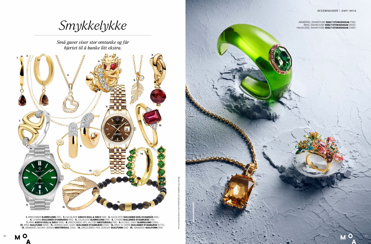 1. ØREDOBBER BJØRKLUND 499,- 2. HALSKJEDE ASECO GULL & SØLV 998,- 3. HALSKJEDE GULLSMED EGIL KVAMSÅS 999,- 4. CHARM GULLSMED STAMNÆSS 999,- 5. HALSKJEDE BJØRKLUND 699,- 6. CHARM GULLSMED STAMNÆSS 799,- 7. RING ASECO GULL & SØLV 1998,- 8. ØREDOBBER, SIFS JACOBS MESTERGULL 1199,- 9. KLOKKE, GANT BJØRKLUND 2999,- 10. RING GULLFUNN 9499,- 11. HERREKLOKKE, GANT GULLSMED STAMNÆSS 2399,- 12. RING TIL HERRE GULLSMED STAMNÆSS 10770,- 13. ARMBÅND, GEORG JENSEN MESTERGULL 2300,- 14. ØREDOBBER, PAN JEWELRY GULLFUNN 549,- 15. ARMBÅND GULLFUNN 399,-